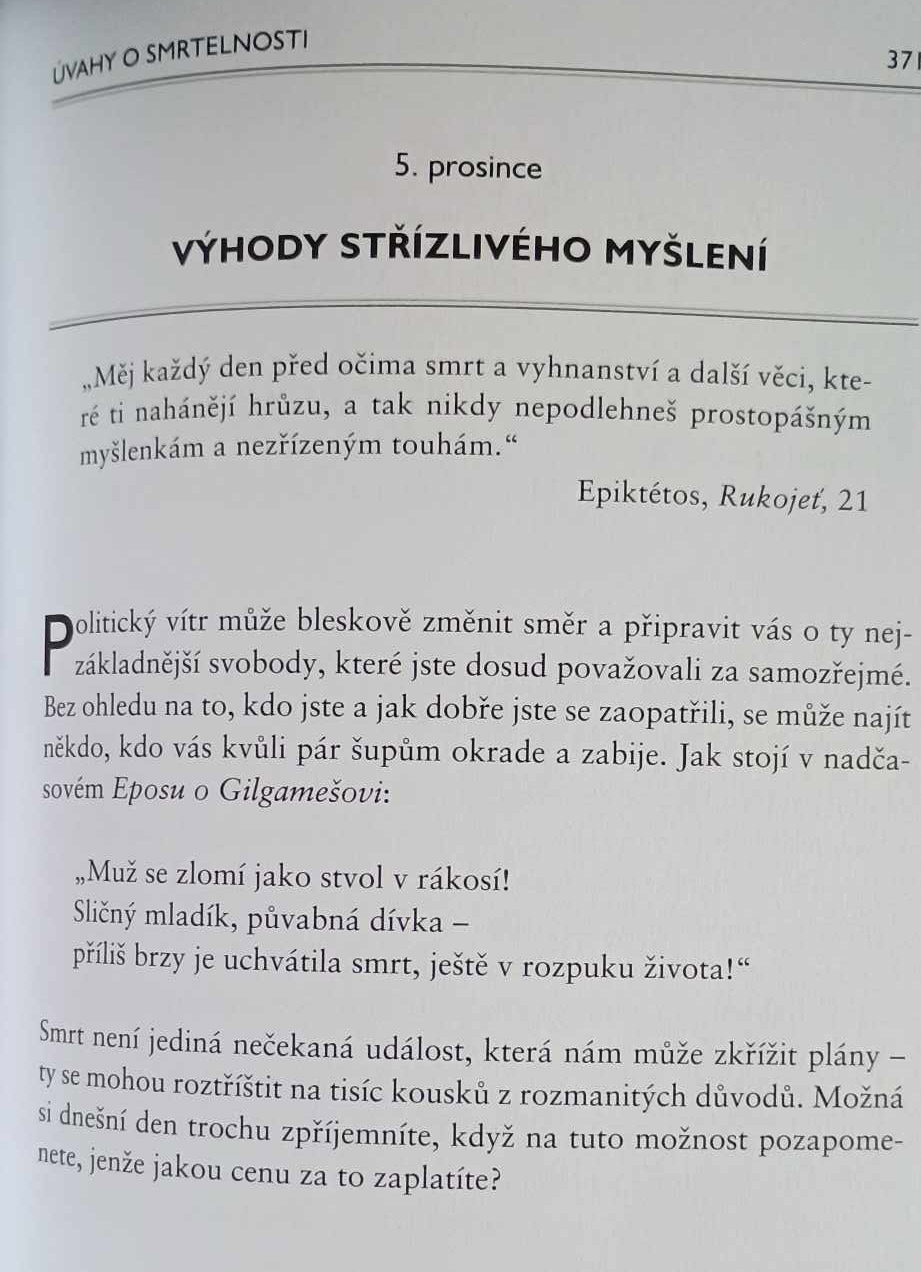 Premisa je opravdu fajn: rychlé, inspirativní čtení na každý den. Krátká stránka třeba před spaním, i když už člověk večer chcípá únavou. No… Jako vstupní brána je to určitě dobré a marketér Ryan Holiday umí předžvýkat a podat čtenářům dokonalý produkt. Jenže když jsem se s nadšením začetl a počítal s tím, že knihu budu mít celý rok na nočním stolku, začal jsem se rychle nudit. Citáty, myšlenky a rady jsou samozřejmě v pořádku, ale všechno je takové neosobní, chladné. Četl jsem názor, že je to jako kuchařka. To sedí, protože kuchařka je taky plná dobrých návodů, do kterých se dá začíst, ale na nočním stolku ji nepotřebujete. Je to taková kuchařka motivace. A pokud jsem z něčeho unavený, tak je to přímočaré motivování citáty. Sebeovládání, přijetí nepřízně osudu, vděčnost, hledání vnitřního klidu… Všechno je naprosto důležité do života aplikovat. Ale tahle zjednodušená seberozvojová forma mi nesedí ani trochu, takže jsem přečetl sotva dvacet stránek a knihu vsunul zpět do knihovny, kde odpočívá už dva roky, aniž bych měl chuť ji vytáhnout.